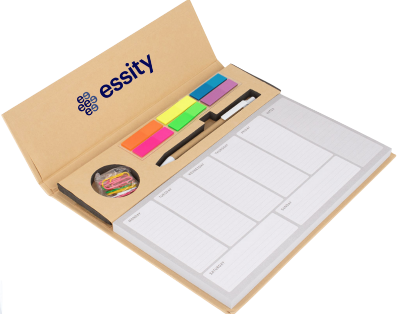 Juego de bloc de notas, cubierta de cartón, 100 hojas con pegatinas de colores, bolígrafo y clips.. Area impresion: Tampo: 7 cm x 4 cm Screen: 20 cm x 5 cm
