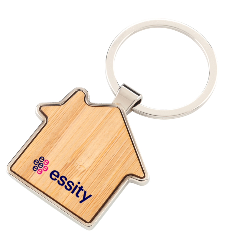 Llavero con forma de casa, combinación metal de acabado brillante y bambú. Empaque bolsa individual.