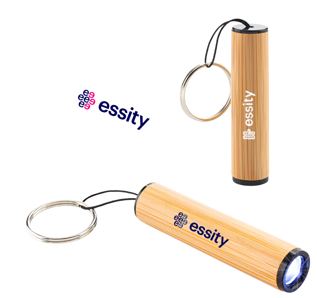 Mini linterna plástica con superficie en bambú de 1 LED. Cordón para cargar.
