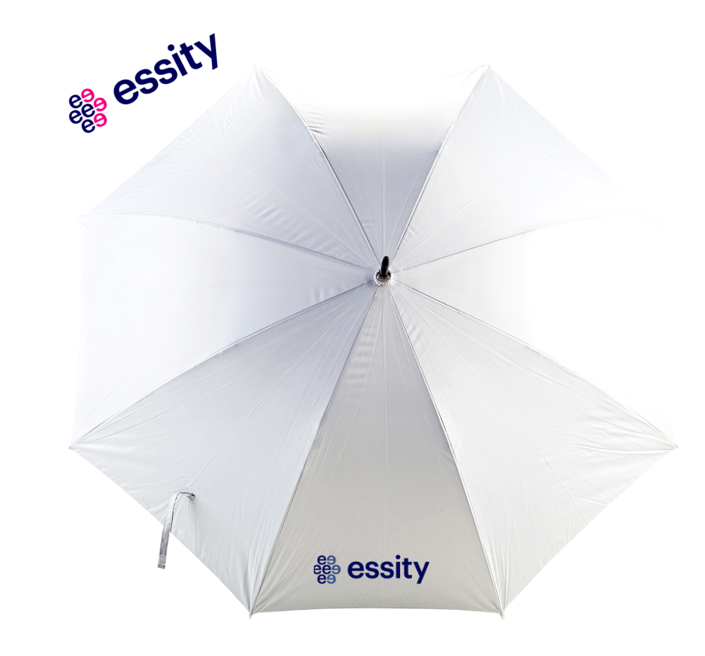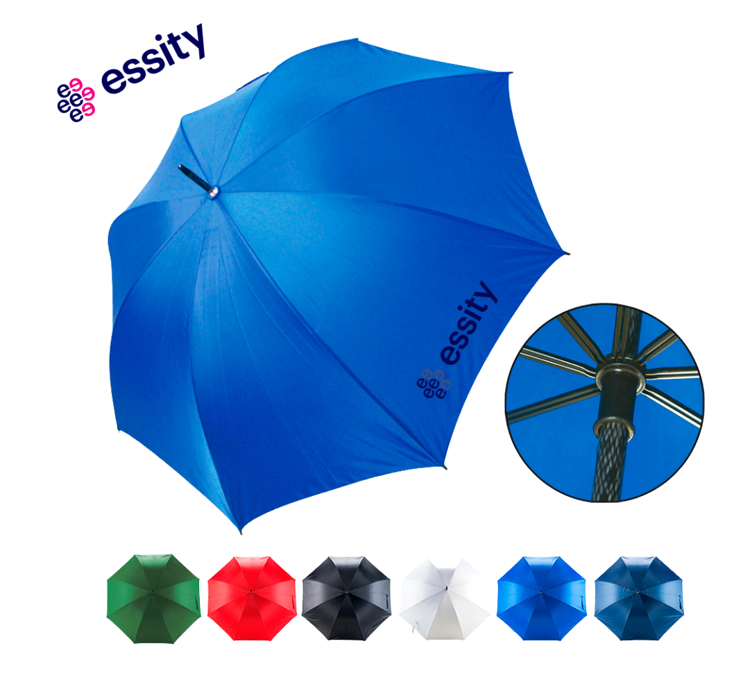 Poliéster pongee 190T. Mango en espuma y doble herraje metálico con fibra de vidrio.
