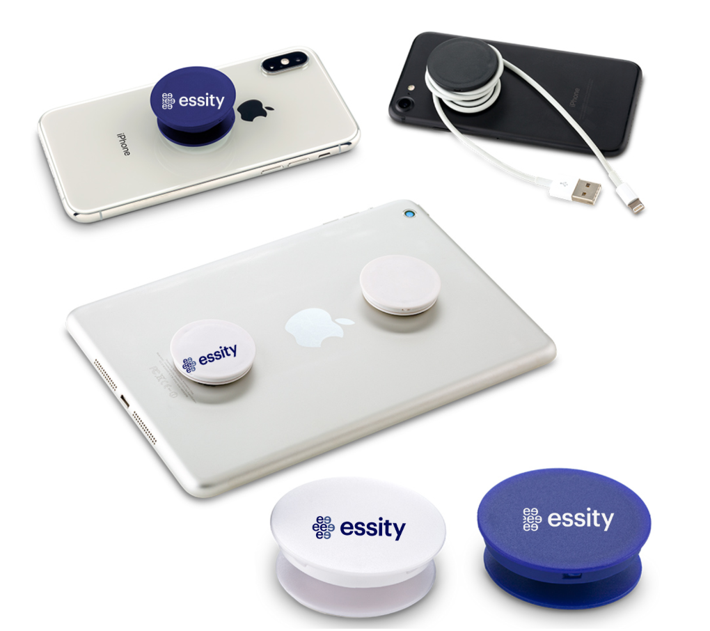 Soporte plastico expandible para celulares con adhesivo 3M. Funciona como organizador de cables. Empaque bolsa individual.